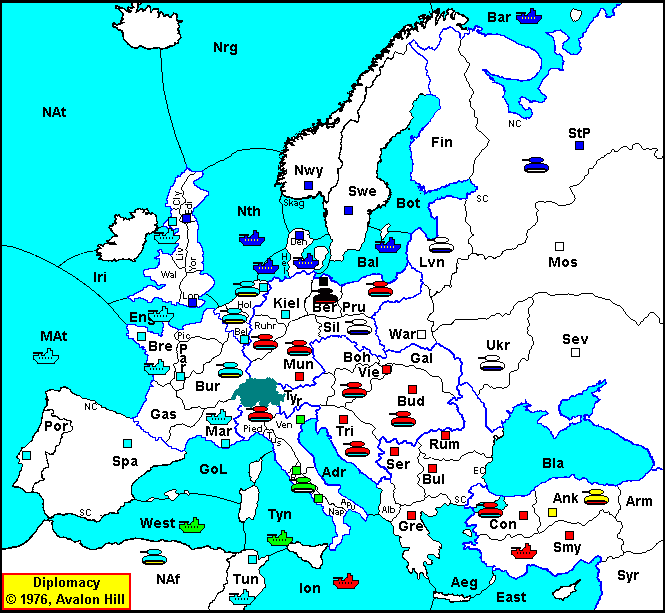 Frankreich hat sich in Stellung gegen E gebracht. Ob das nur eine Finte war oder ob das wirklich ein Konflikt zwischen den beiden ist, wird der nächste Zug zeigen. Was für mich aber klar ist, dass ich 'offen wie ein Scheunentor' stehe. Und das werde ich nun ändern. Österreich wird, wenn Russland und ich nicht die Seiten wechseln, ohne Probleme ein Solo ansteuern. Andreas sucht meinen Kontakt. Ich werde ihn nun auch nicht angreifen. Wenn alles klappt, bekomme ich trotzdem Tun von ihm und kann dadurch aufbauen. Russland soll sich jetzt auch Richtung Österreich bewegen. England hat sich nun auch nochmal gemeldet und auf das bevorstehende Solo hingewiesen. Mir scheint, dass Jürgen Probleme bekommen könnte. Wenn er allerdings jetzt schon stabben will, verpufft unser Angriff ohne viel Wirkung. Aber dann wird das noch ein heisser Tanz im Mittelmeer. |