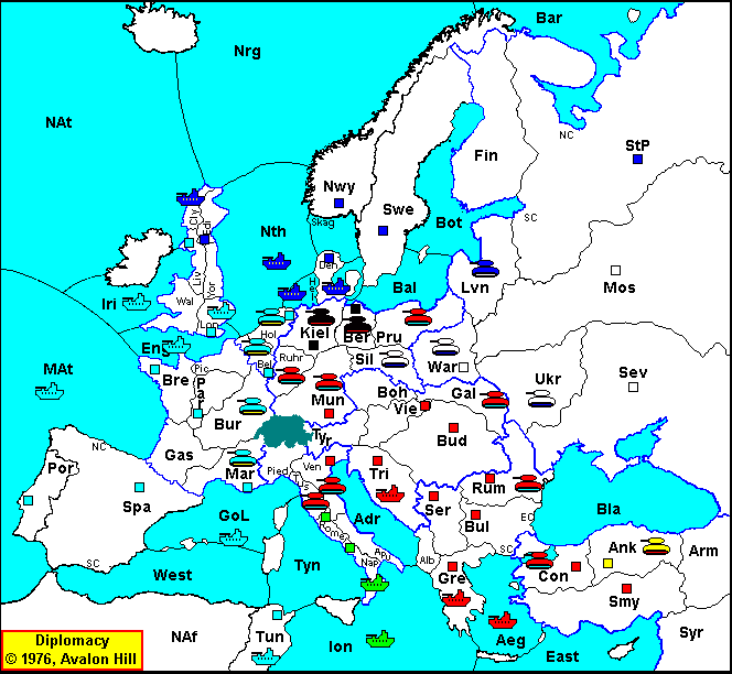 Bounce with Ank 1:1; Aeg S Ion H: OK Ven S Pie - Tus: OK Pie - Tus: OK Bud - Rum: OK Ion S Tun H: Cut by Tyn; Dislodged by Tyn 3:2; Gal S Bud - Rum: OK Pru S Mun - Ber: OK Mun - Ber: Bounce with Bal 2:2; Ruh S Hol H: OK |