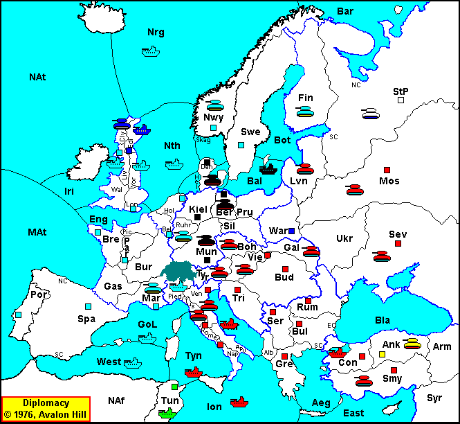 Defeated by Mar 2:1; Dislodged by Mar 2:1; Ven - Tyr: OK Rom - Tus: OK Nap - Tyn: OK Ion S Nap - Tyn: OK Tri - Adr: OK Con - Smy: OK Aeg - Con: OK Sev - Arm: Bounce with Ank 1:1; Mos S Lvn H: OK Lvn S Mos H: Cut by Den; Boh - Sil: Bounce with Ber 1:1; Bud - Gal: OK Vie - Boh: Bounce with Boh 1:1; |
