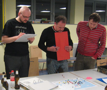 die Kombination von kühlem Bier mit heißen Verhandlungen ist das, was den besonderen Reiz dieser ersten reinen Varianten-Con auf deutschem Boden ausmacht. Dafür waren enthusiastische Vollblut-FTFler sogar bereit, den langen Marsch von Moskau bzw. Paris auf sich zu nehmen - aber auch ein amtierender Europameister* sowie der Deutsche Meister** waren mit viel Spaß und Engagement dabei. Unser Bild zeigt eine hochkonzentrierte Momentaufnahme mit Sven von Bargen, Christian Reichardt und Felix Happich (v.l.n.r.) aus der Loeb9-Partie in Runde 2, die André Ilievics mit Russland souverän gewann.